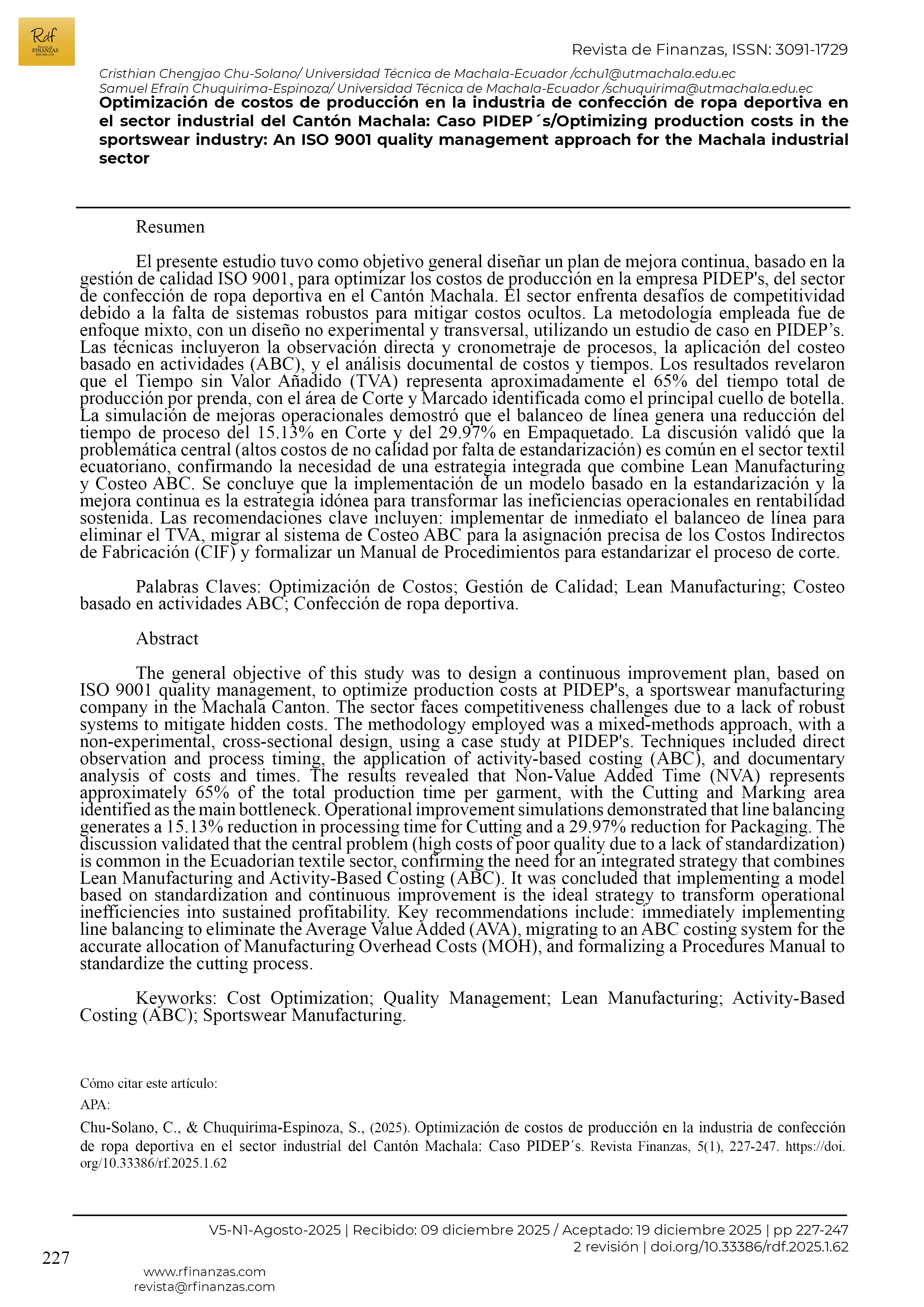 • Optimización de costos de producción en la industria de confección de ropa deportiva en el sector industrial del Cantón Machala: Caso PIDEP´s